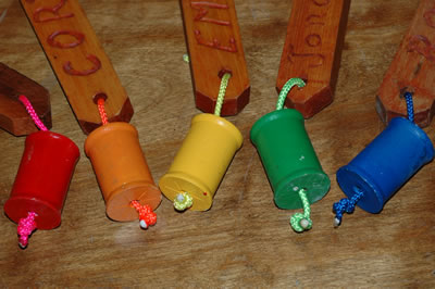 Hanging beneath this tag is a small painted spool. The spool is painted either: