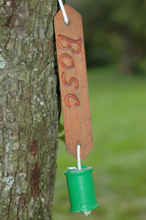 Each tree in the orchard has a small wooden tag with the type of apple carved into it. The tags are hanging near the bottom of the trunk.
